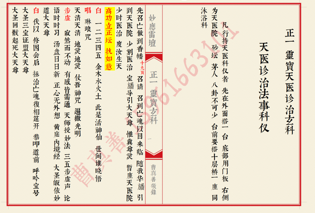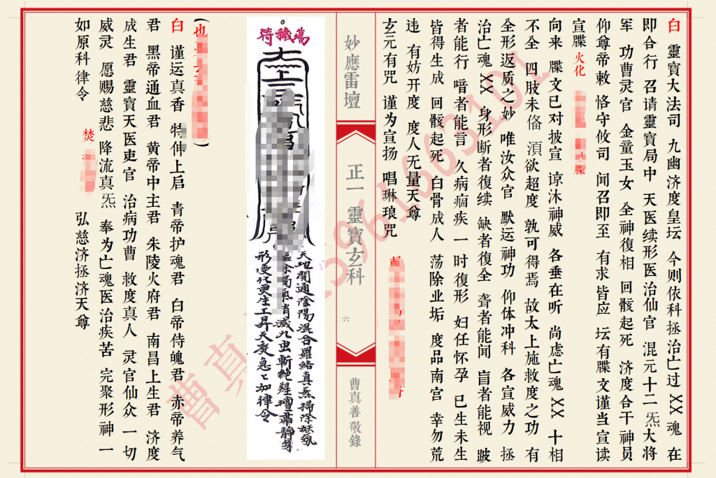 天医拯治法事是度亡超拔斎醮中的临坛穿插法事,它的对象必须是非正常死亡者,道家用设天医院和建沙坛图的方式,用天医元科的法术为亡者疗疾全形,并根据亡者生前所患之疾对症下药,俨然亡者生前请医就症一般,法事使用大量符秘。